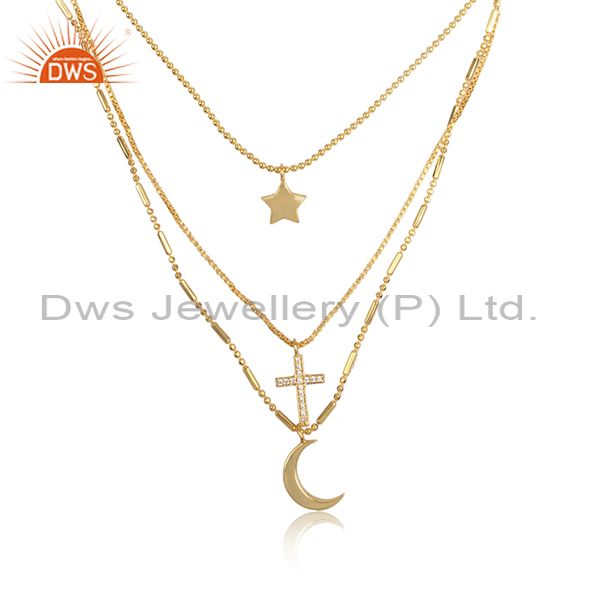 CZ Star Moon Cross Charm Set Brass Gold Multi Chain Necklace