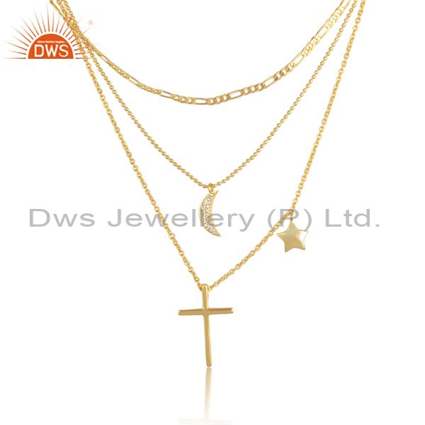 CZ Star Moons And Cross Charms Set Fancy Brass Gold Necklace