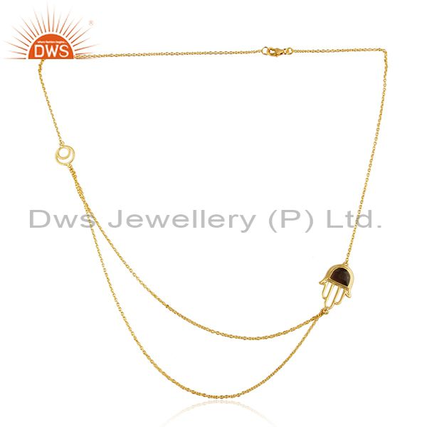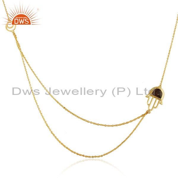 Designer Hamsa Hand Two Row Necklace in Gold on Silver with Smoky