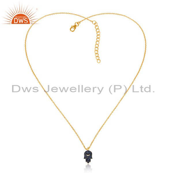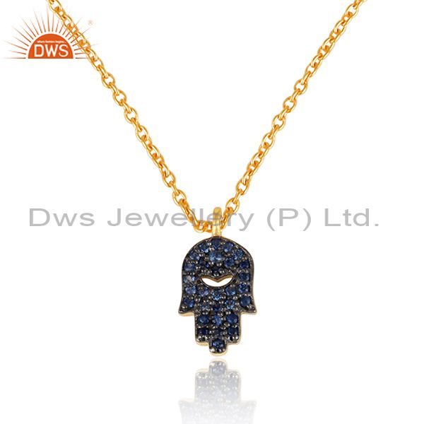 Designer Hamsa Pave Blue Sapphire Charm Necklace in Gold on Silver