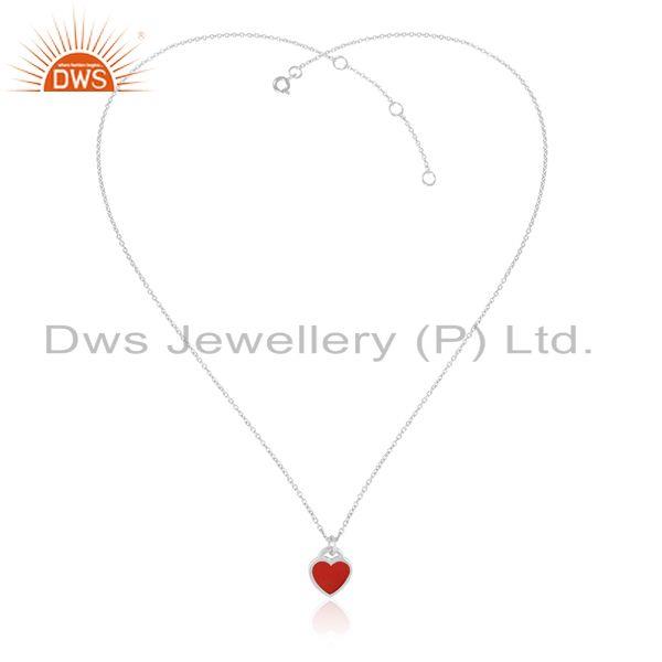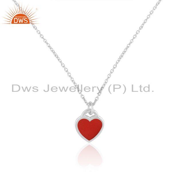Designer Red Enamel Heart Charm Necklace In Rhodium Over Silver