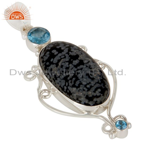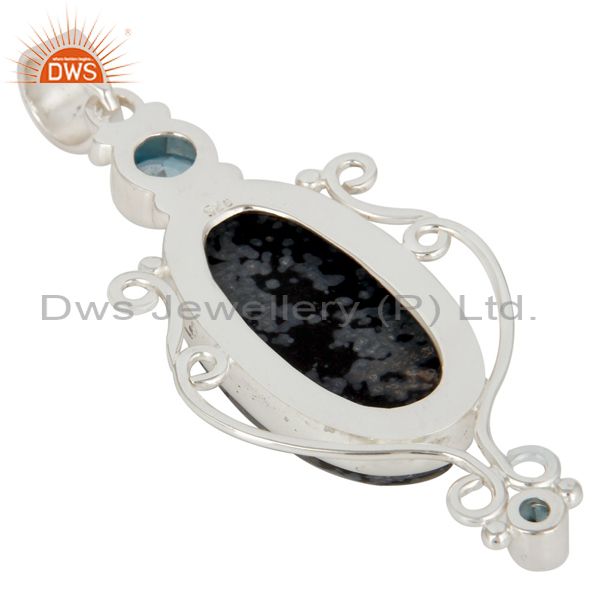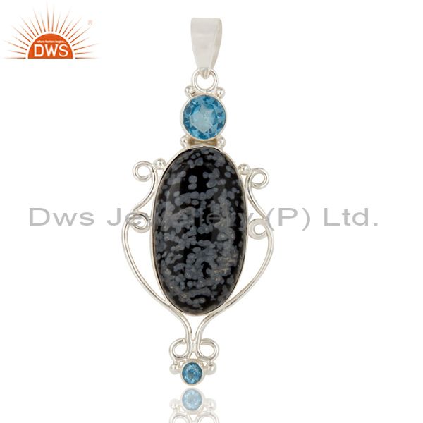 Handmade Sterling Silver Natural Snowflake Obsidian And Blue Topaz Pendant