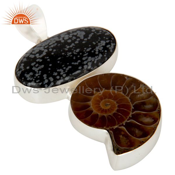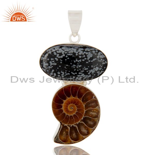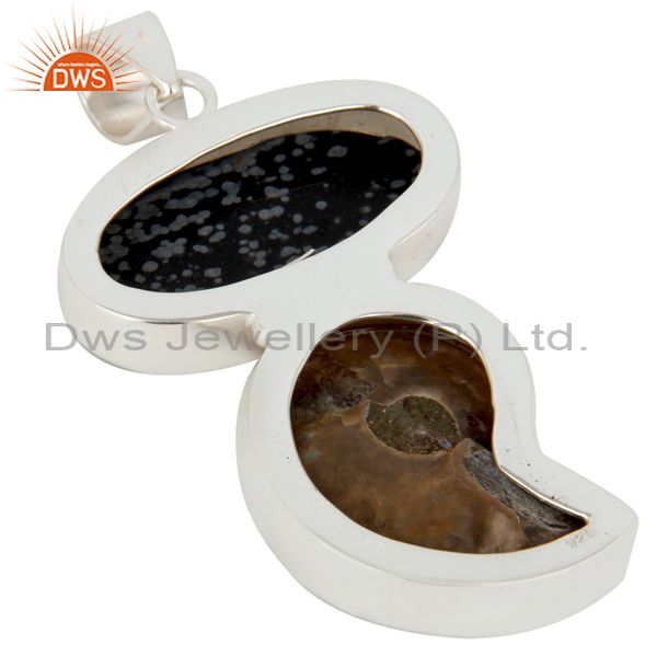 Handmade Sterling Silver Snowflake Obsidian And Ammonite Bezel Set Pendant