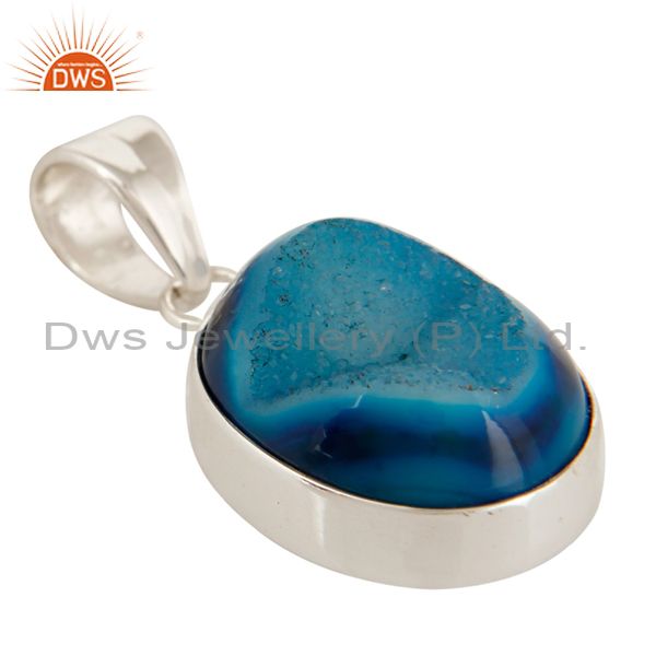Ladies Genuine Oval Blue Druzy Agate Solid Sterling Silver Handmade Pendant
