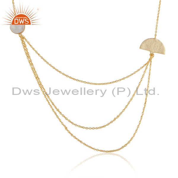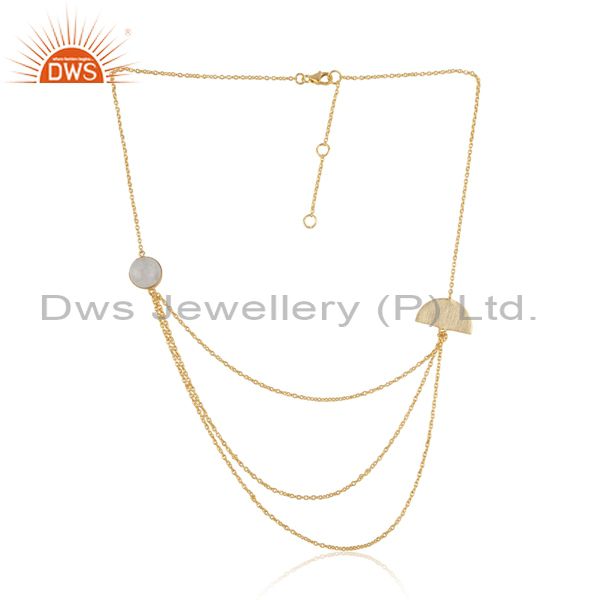 Moon Design Multilayered Rainbow Moonstone Gold on Silver Necklace