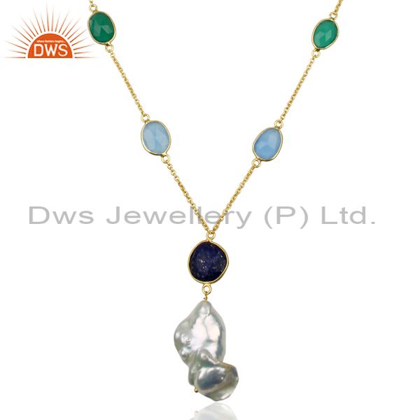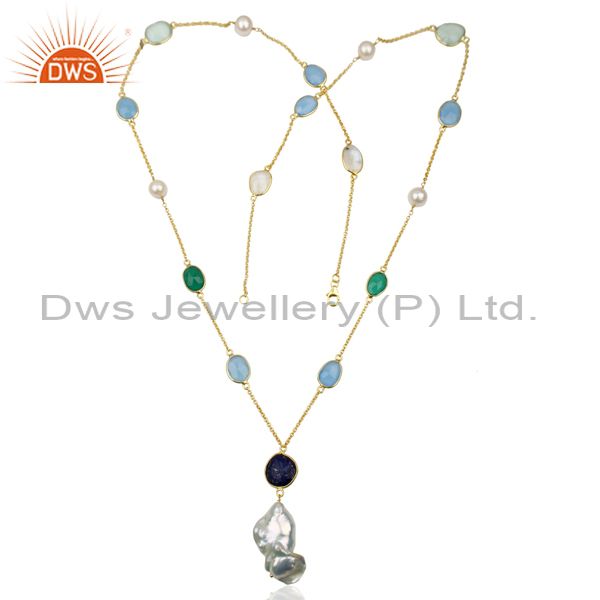 Multi Gemstone Bezel Set 925 Sterling Silver 14K Gold Plated Pendant Necklace