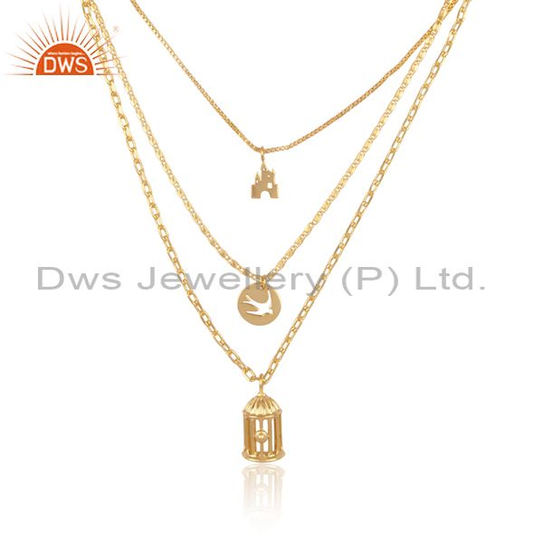 Multiple Charms Set Brass Gold Triple Chain Fancy Necklace