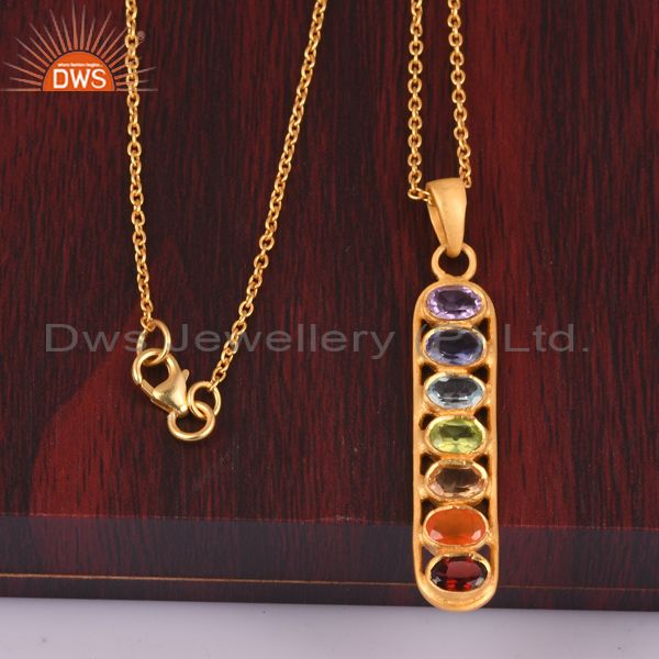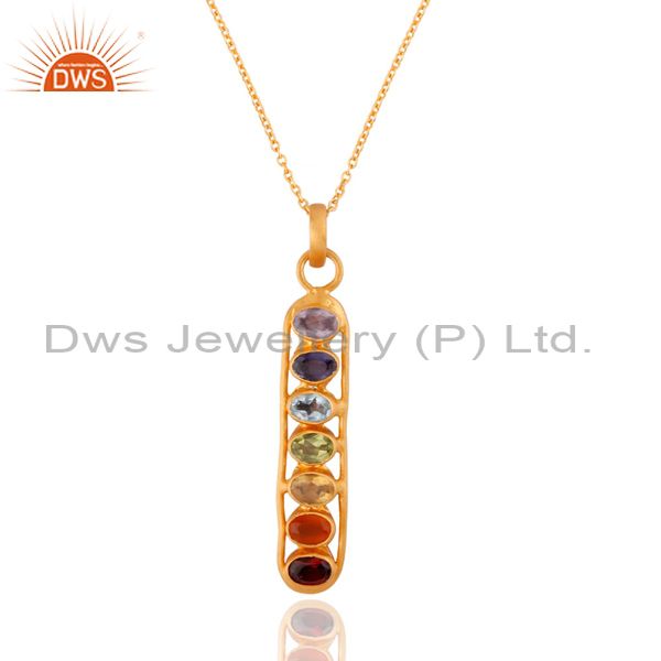 Natural Seven Chakra Gemstone Sterling Silver Pendant With 18K Gold Plated 16"