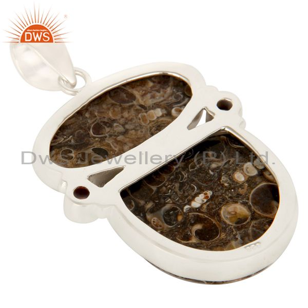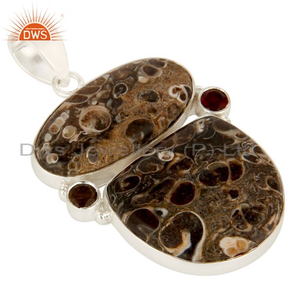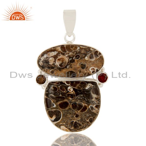 Natural Turritella Agate, Garnet And Smoky Quartz Sterling Silver Stone Pendant