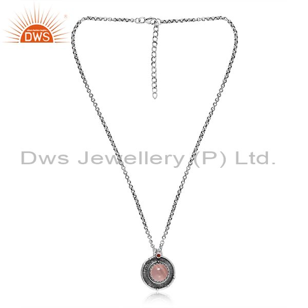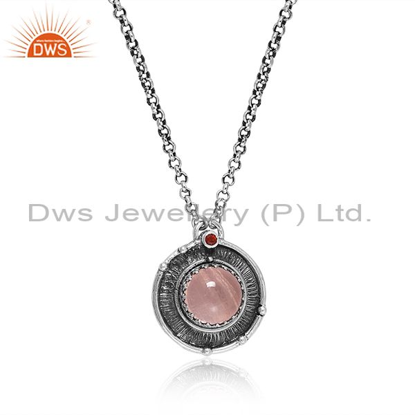 Oxidized Silver Pendant & Necklace With Garnet & Rose Quartz