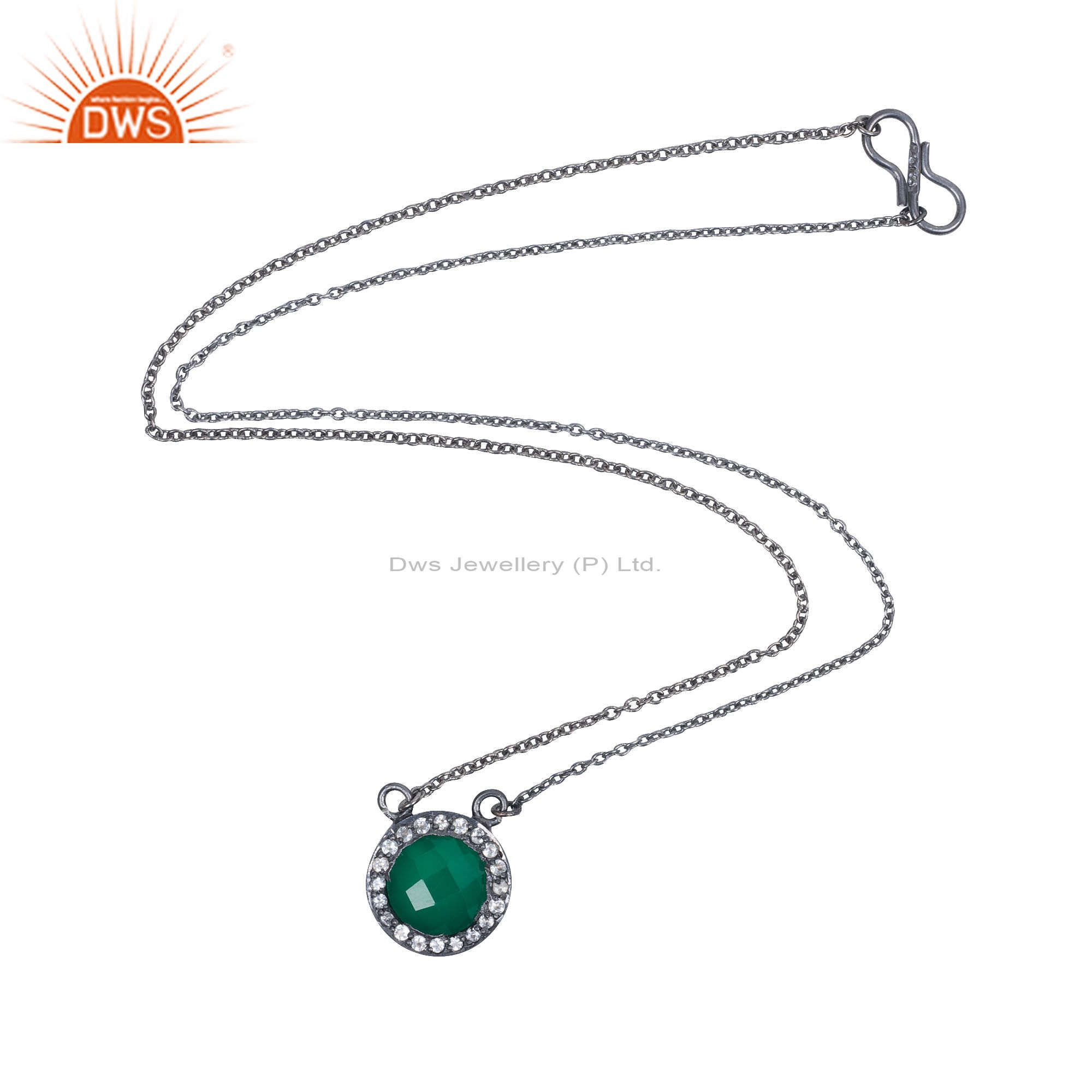 Oxidized Sterling Silver Green Onyx And White Topaz Halo Pendant Chain Necklace
