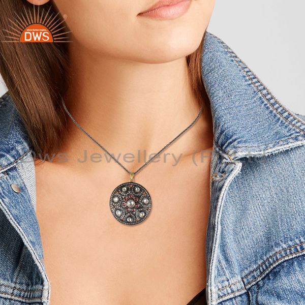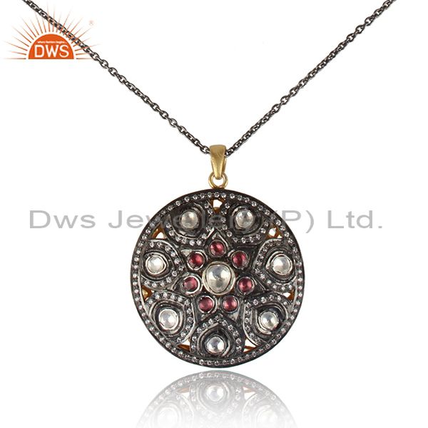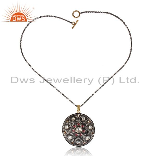 Oxidized Sterling Silver Rhodolite And Cz Polki Victorian Pendant Chain Necklace
