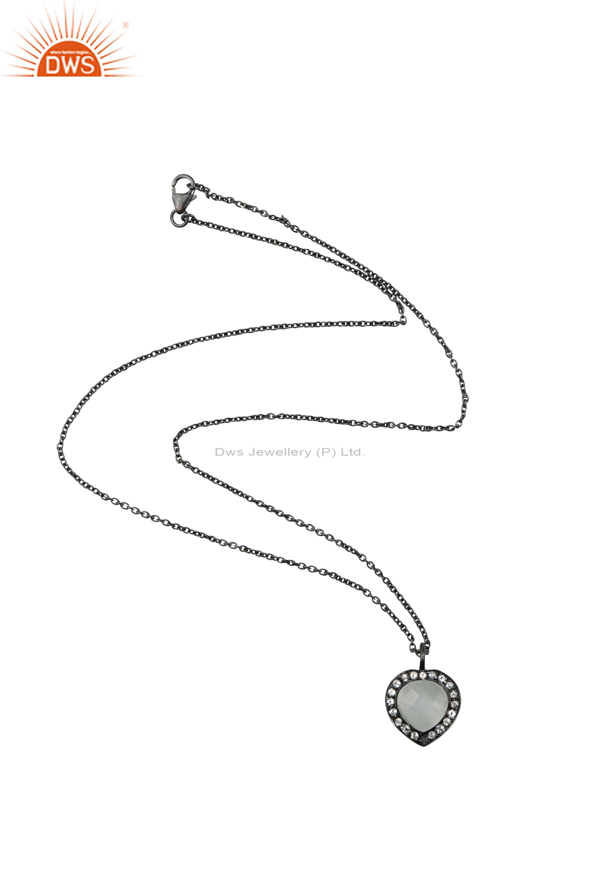 Oxidized Sterling Silver White Moonstone & White Topaz Heart Pendant With Chain