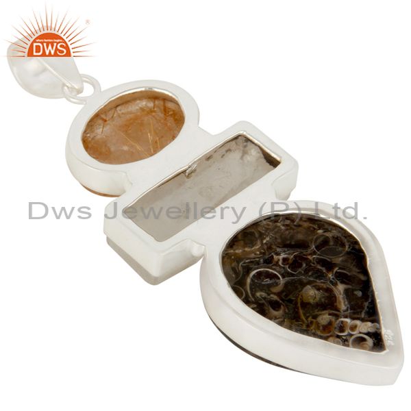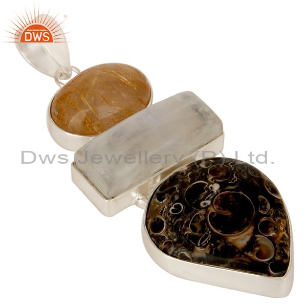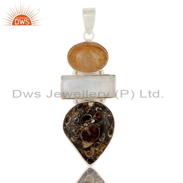 Rainbow Moonstone, Rutilated Quartz And Turritella Agate Sterling Silver Pendant