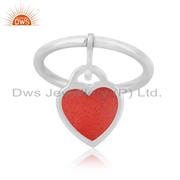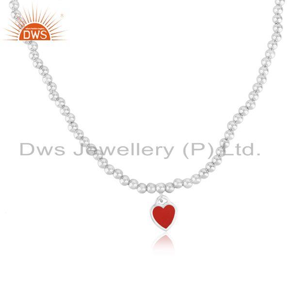 Red Enamel Heart Charm Beaded Necklace In Rhodium Over Silver