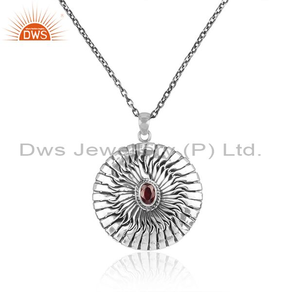 Red Garnet Round Pendant And Oxidized Silver Classic Chain