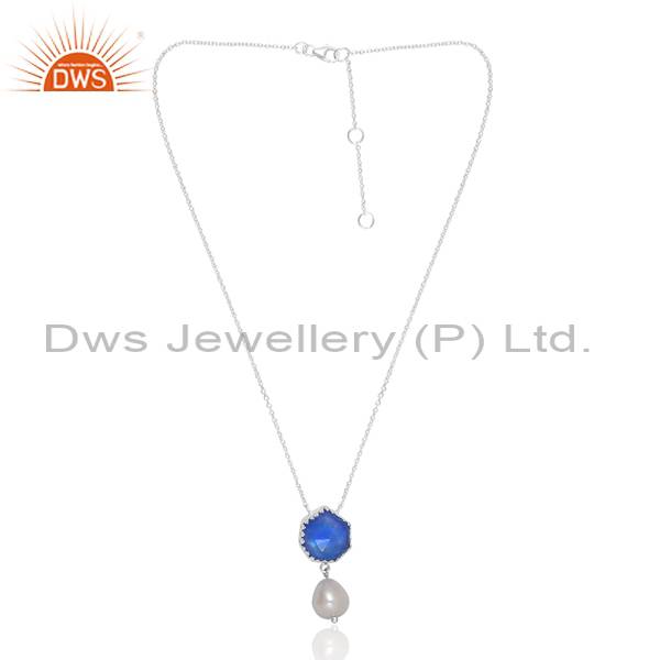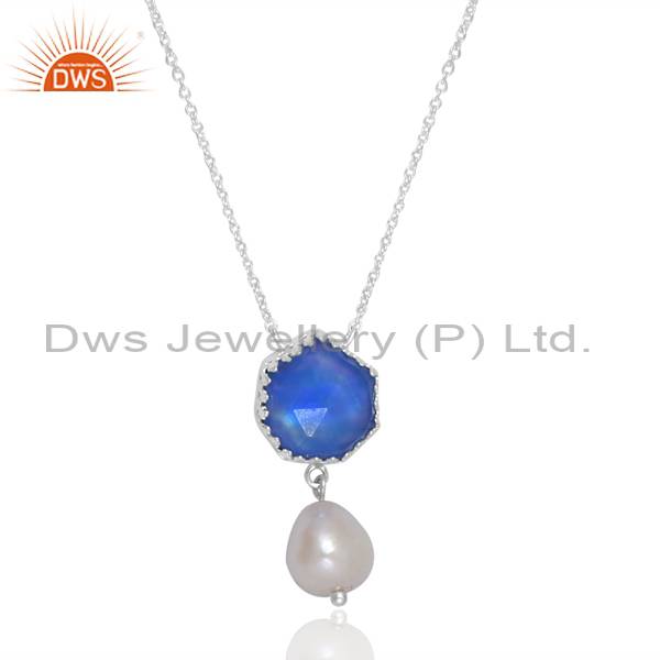 Silver Trendy Necklace With Aurora Opal Blue And Pearl Beads