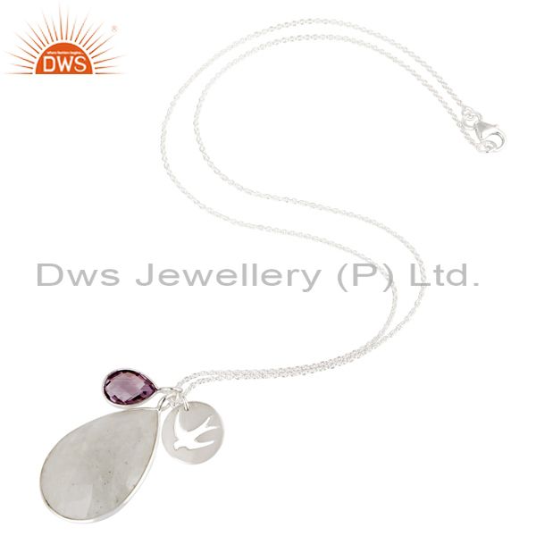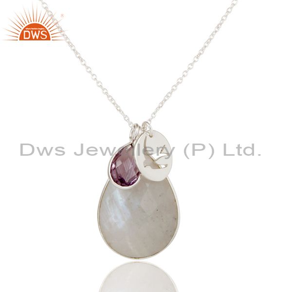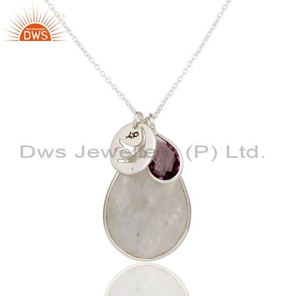 Solid 925 Sterling Silver Amethyst & Rainbow Moonstone Bezel Set Chain Pendant