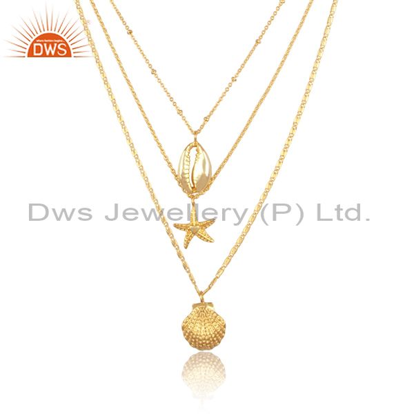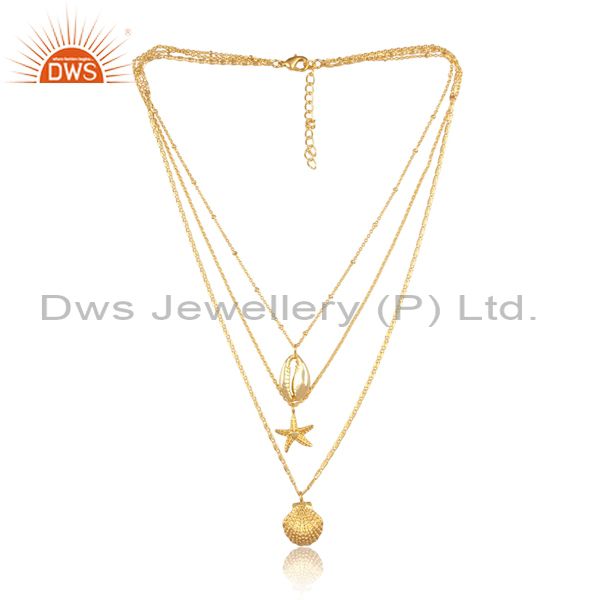 Star, Oval, Round Charms Set Brass On Gold Triple Necklace