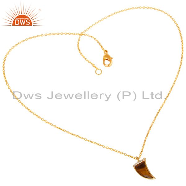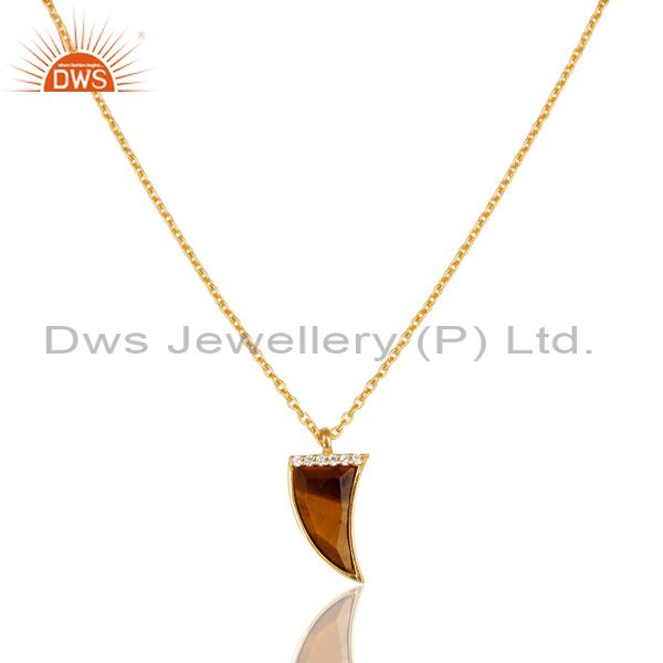 Tigereye Horn Cz Studded 14 K Gold Plated Chain 92.5 Sterling Silver Pendent