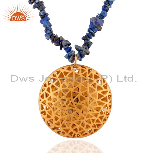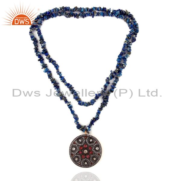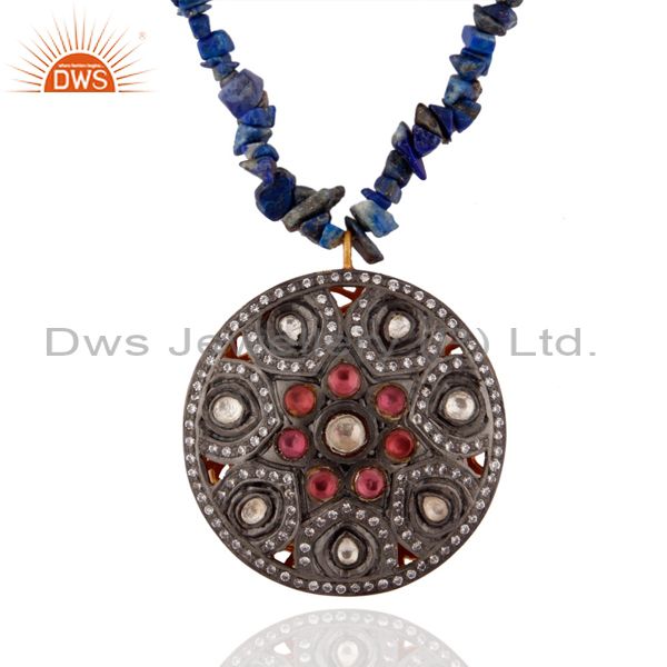 Victorian Style 925 Silver Polki Crystal Pendant Lapis Lazuli Chips Necklace Cz
