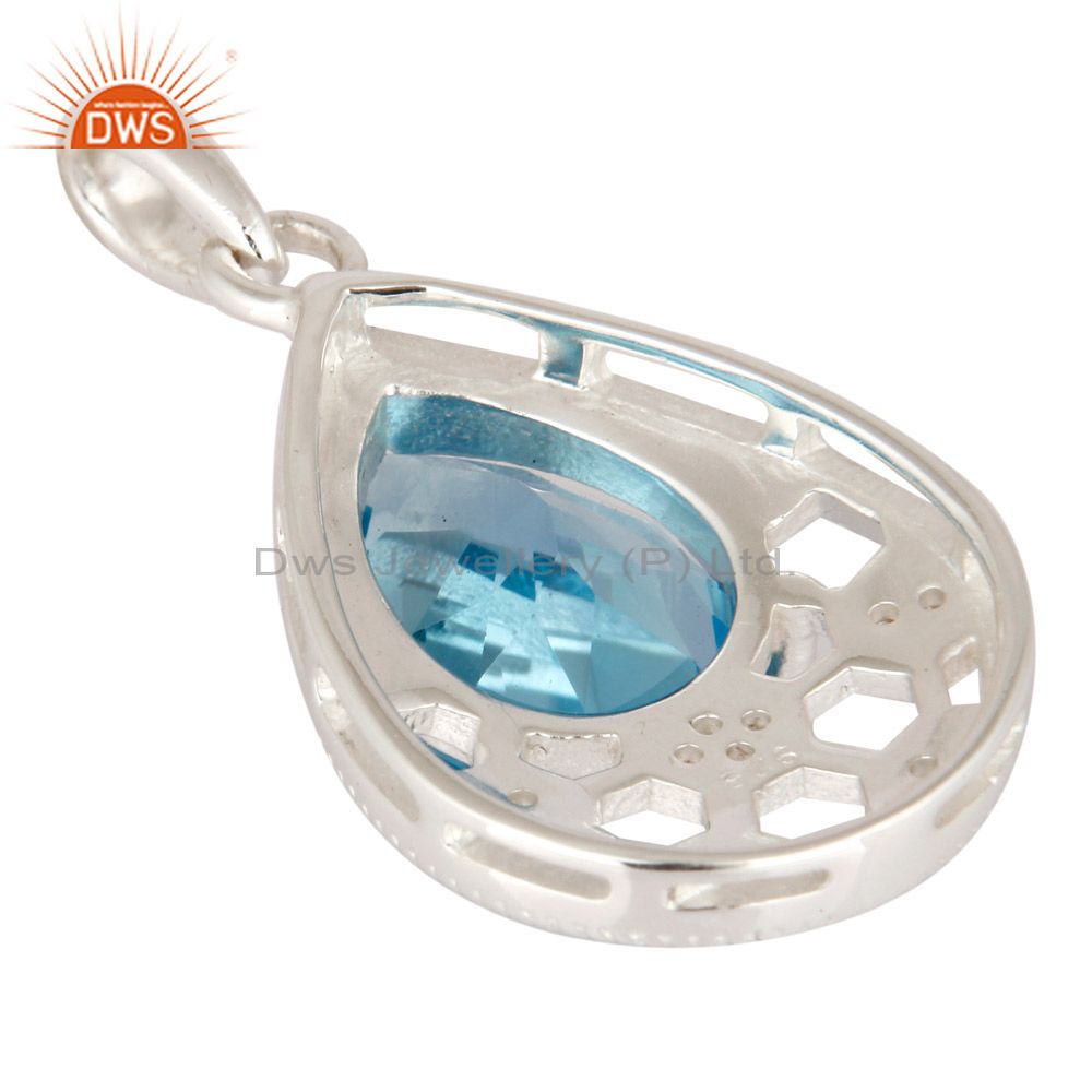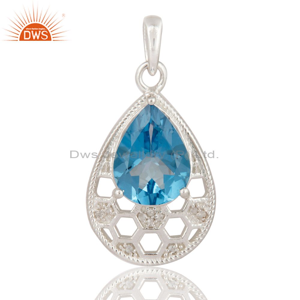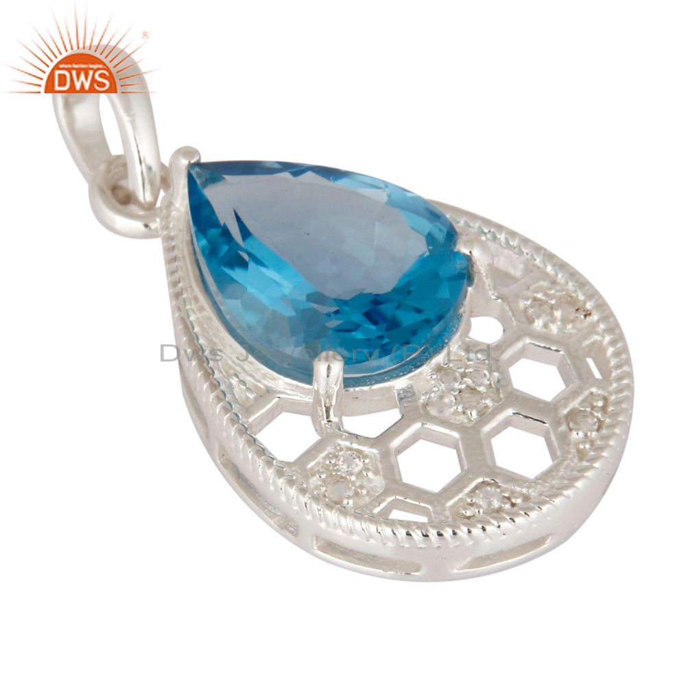White Topaz & Swiss Blue Topaz Gemstone Sterling Silver Solitaire Style Pendant