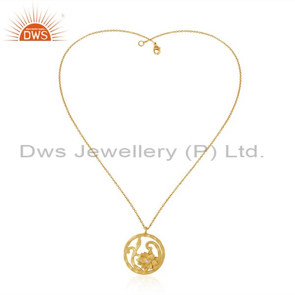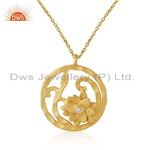 White Zircon Yellow Gold Plated Brass Fashion Floral Design Pendant With Chain