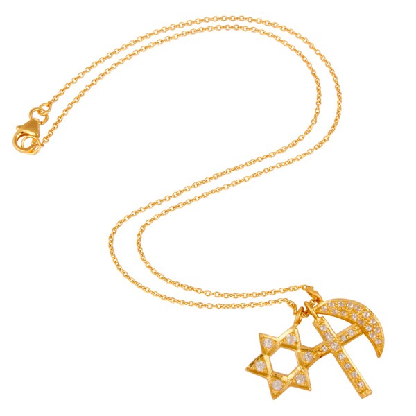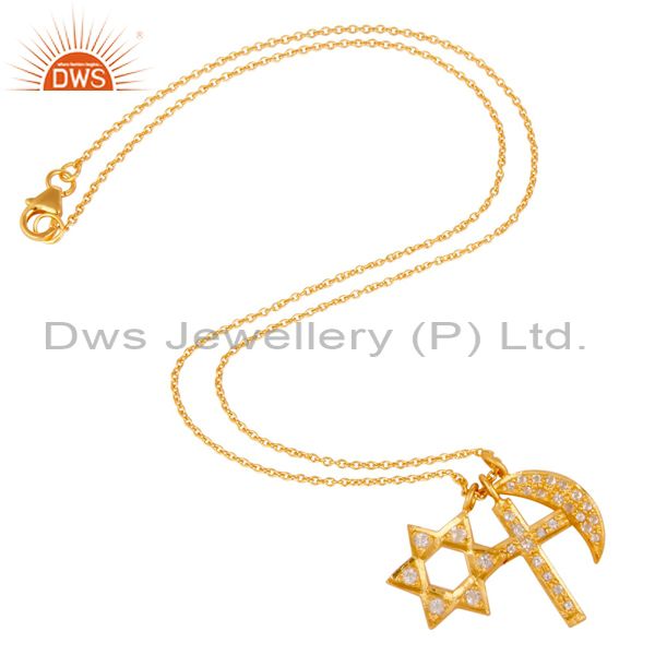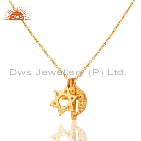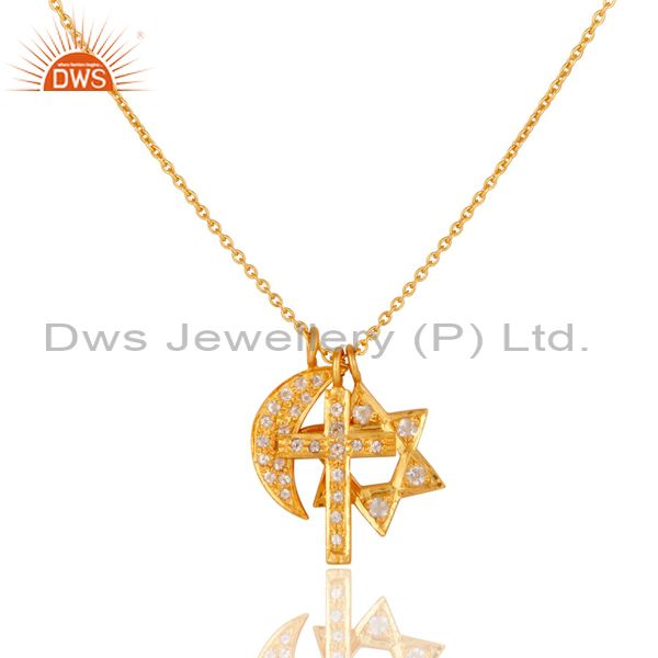 Yellow Gold Plated Silver White Topaz Cross, Half Moon & Star Charms Necklace