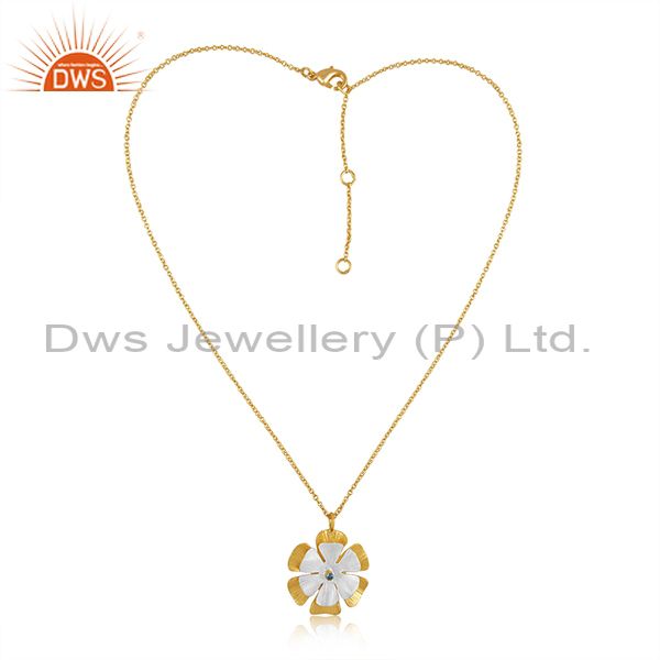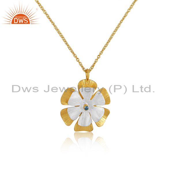 Zircon Swiss Blue Topaz Floral Brass Gold Pendant And Chain