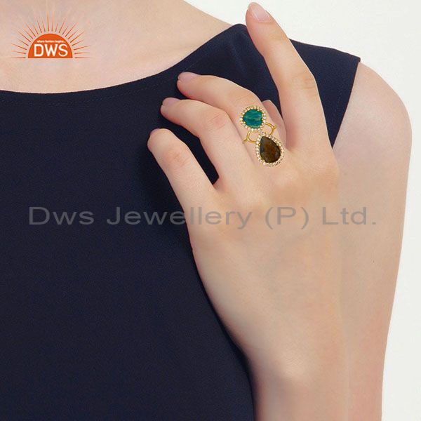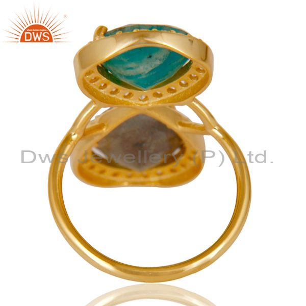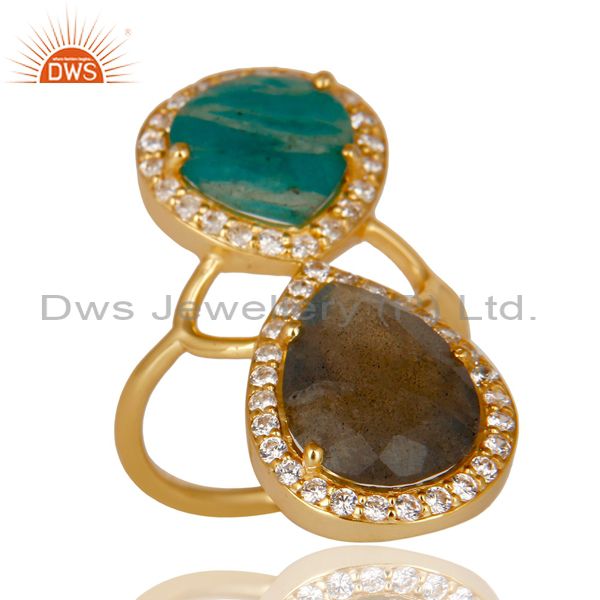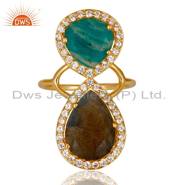 14K Gold Plated Labradorite, Amazonite & White Zircon Statement Brass Ring