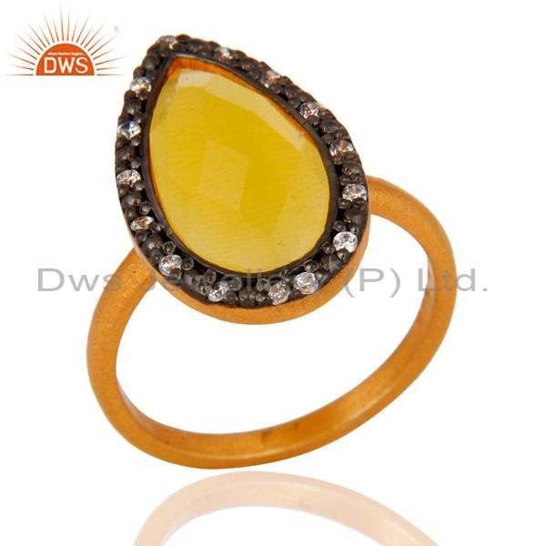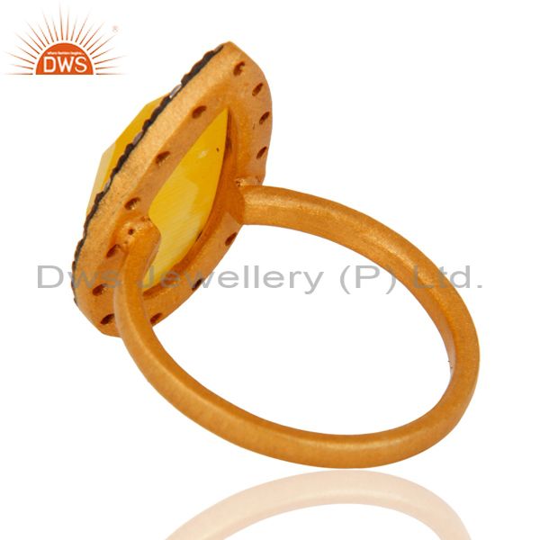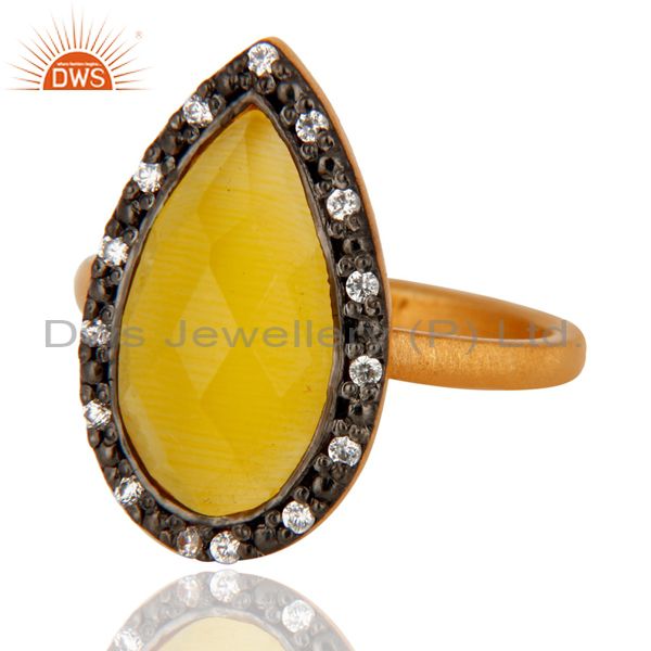14K Gold Plated Yellow Moonstone 925 Sterling Silver Gemstone Ring With Pave Cz