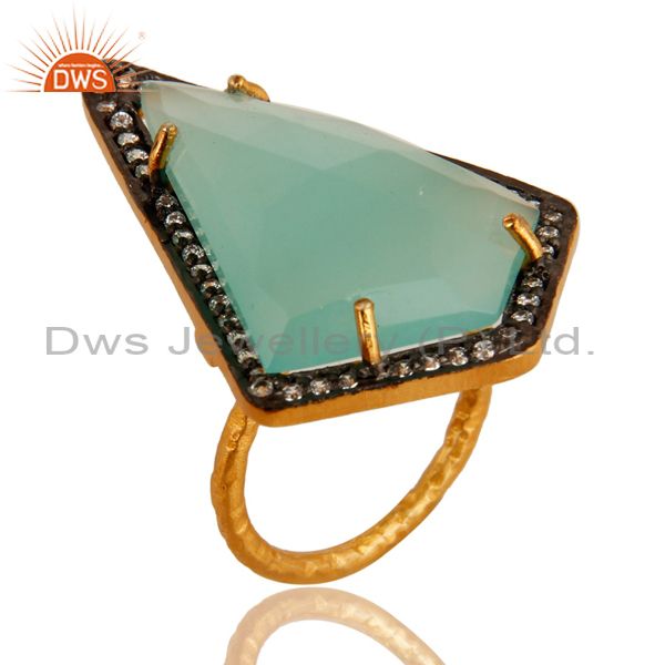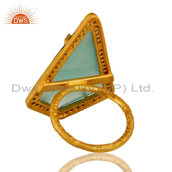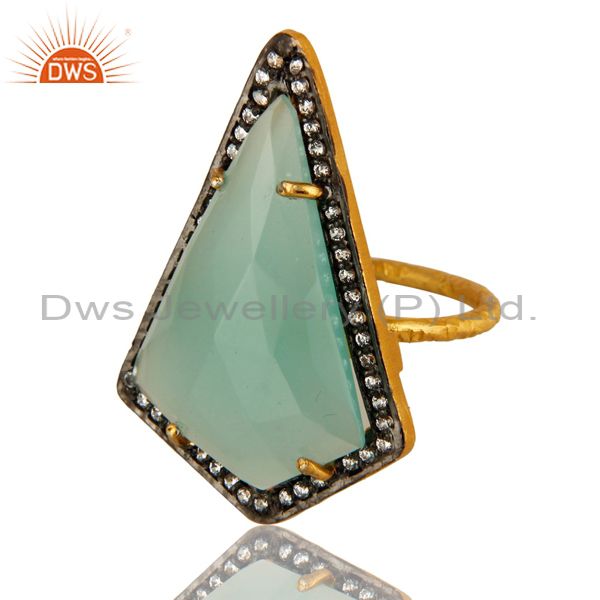 14K Yellow Gold Plated 925 Silver Aqua Chalcedony Solitaire Ring With CZ