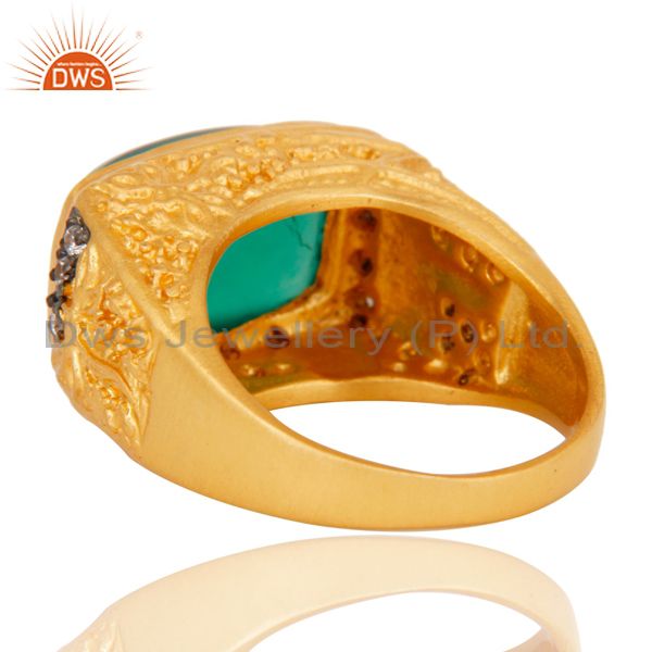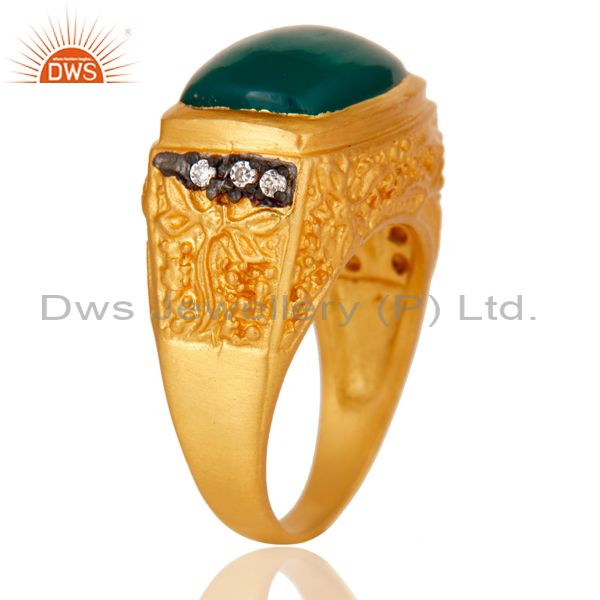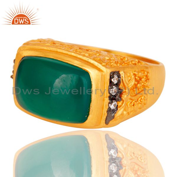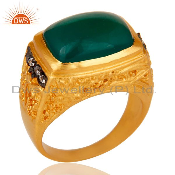 14K Yellow Gold Plated Brass Designer Ring With Green Onyx And White Zircon