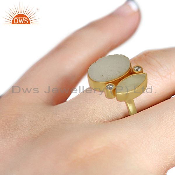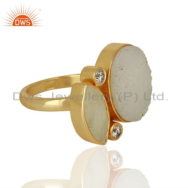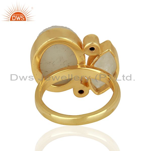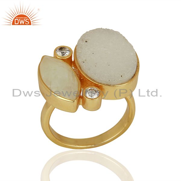 14K Yellow Gold Plated Rainbow Moonstone Druzy & Cz Statement Brass Ring