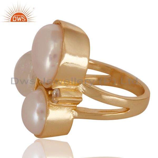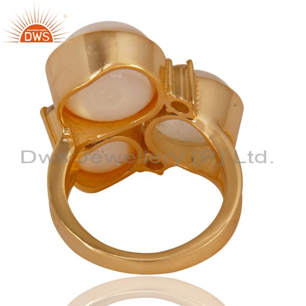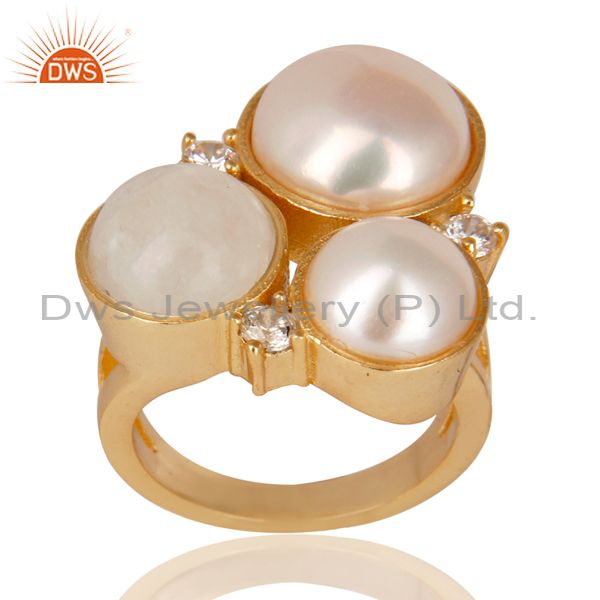 14K Yellow Gold Plated Rainbow Moonstone Pearl & CZ Statement Brass Ring