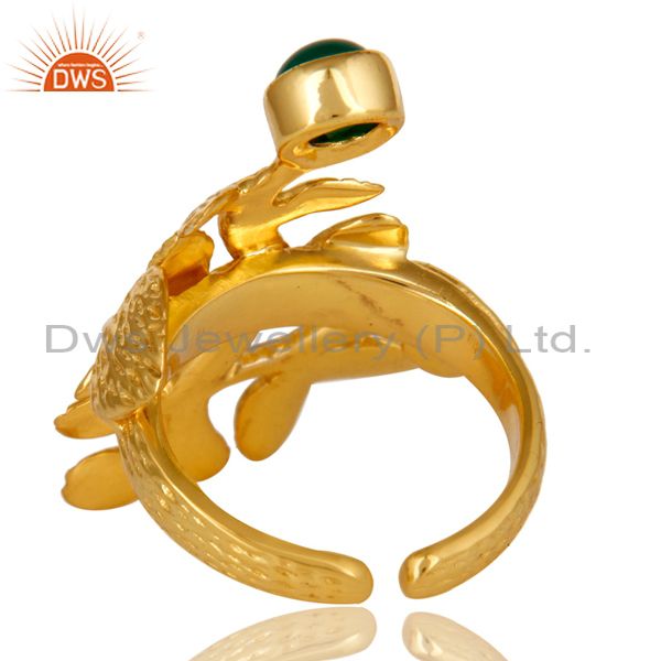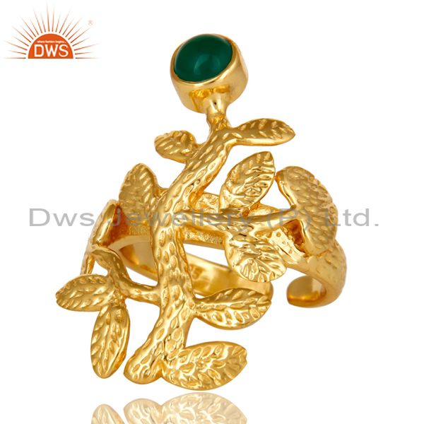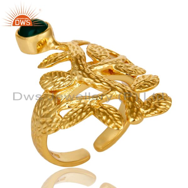 14K Yellow Gold Plated Sterling Silver Green Onyx Textured Statement Open Ring