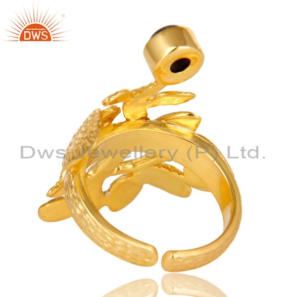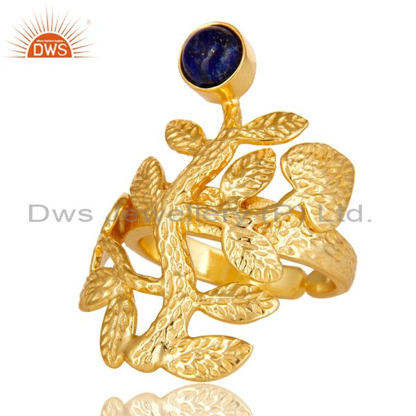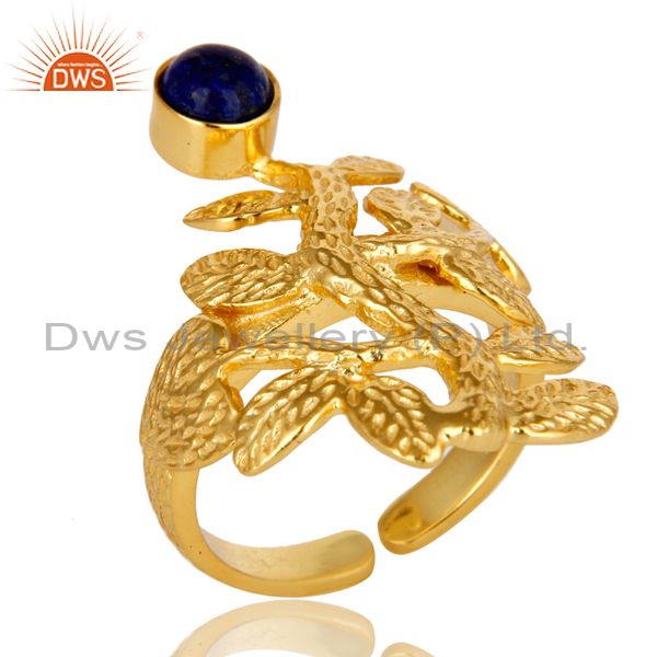 14K Yellow Gold Plated Sterling Silver Lapis Lazuli Textured Floral Design Ring