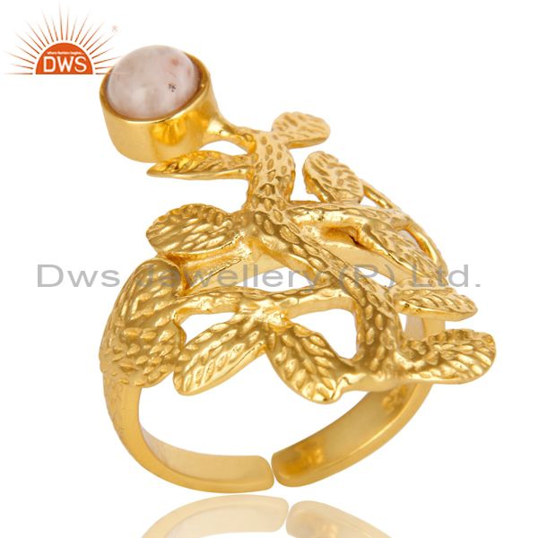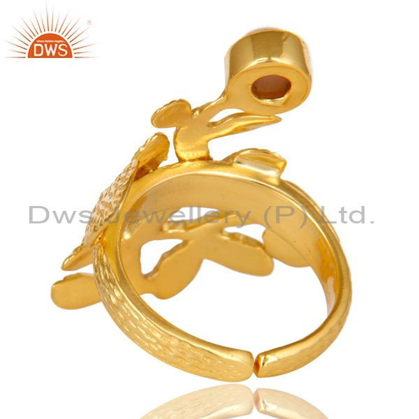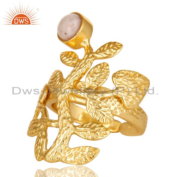 14K Yellow Gold Plated Sterling Silver Pink Opal Textured Floral Designer Ring