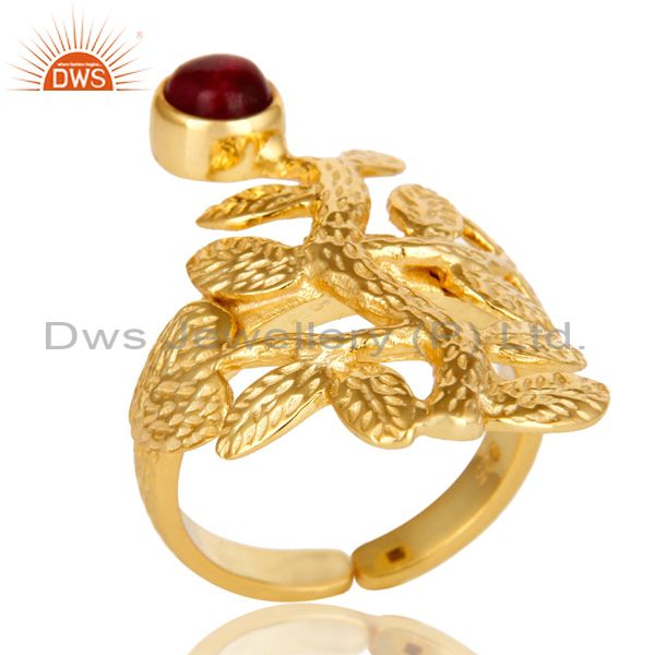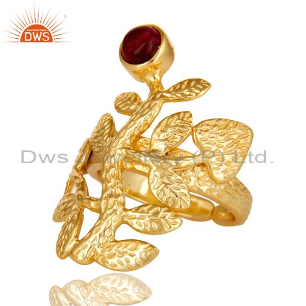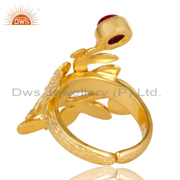 14K Yellow Gold Plated Sterling Silver Ruby Textured Floral Designer Ring