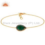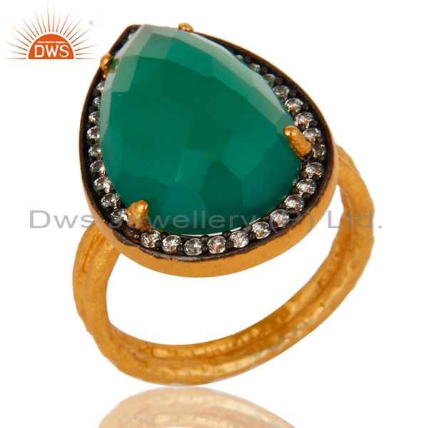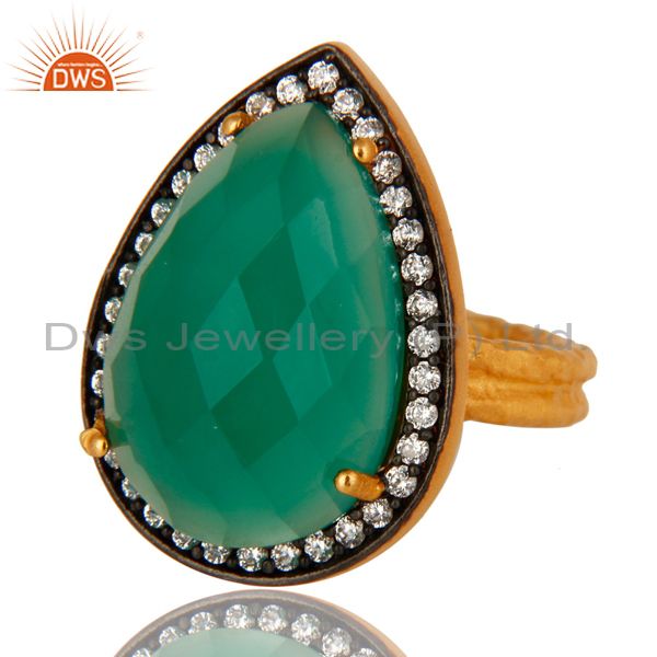 18K Gold Plated Sterling Silver Prong Set Green Onyx Gemstone Ring With Cz
