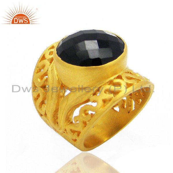 18K Yellow Gold Plated Brass Black Onyx Gemstone Filigree Design Dome Ring