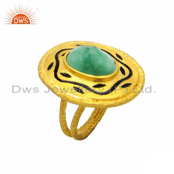 18K Yellow Gold Plated Sterling Silver Emerald Cocktail Ring With Enamel Work