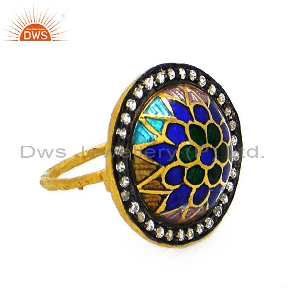 18K Yellow Gold Plated Sterling Silver Enamel Work Cocktail Ring With Cz