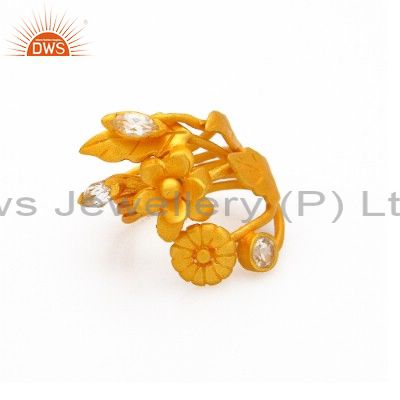 18K Yellow Gold Plated Sterling Silver White Topaz Floral Design Statement Ring