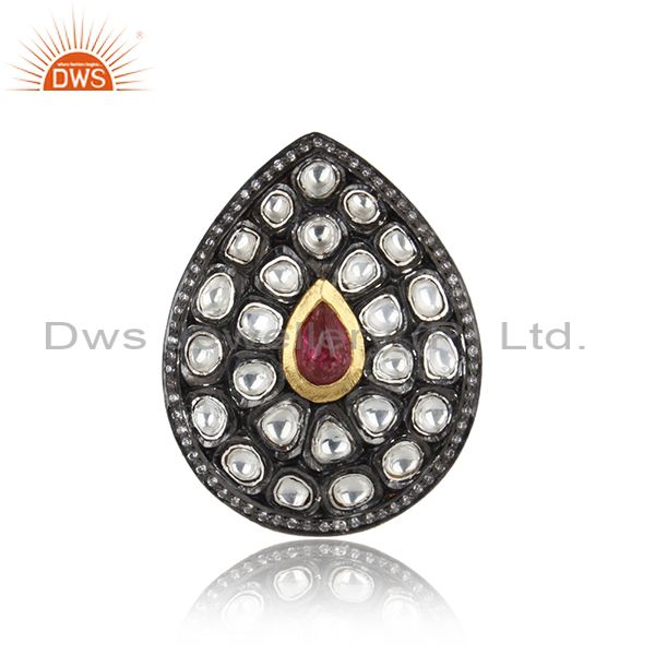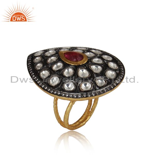 22K Gold Plated Sterling Silver Pink Tourmaline & Cz Polki Victorian Style Ring