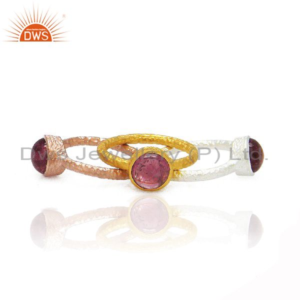 22K Gold Plated Sterling Silver Pink Tourmaline Hammered Stack Ring 3 Pcs Set