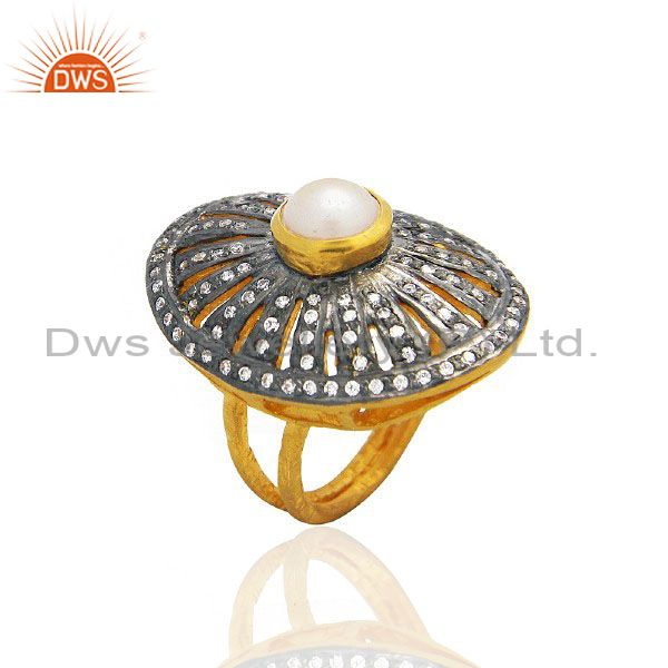 22K Yellow Gold Plated Brass Pearl And Cz Victorian Style Cocktail Ring