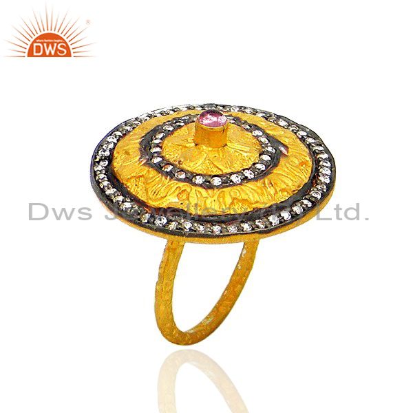 22K Yellow Gold Plated Brass Pink Glass And Cubic Zirconia Fashion Cocktail Ring