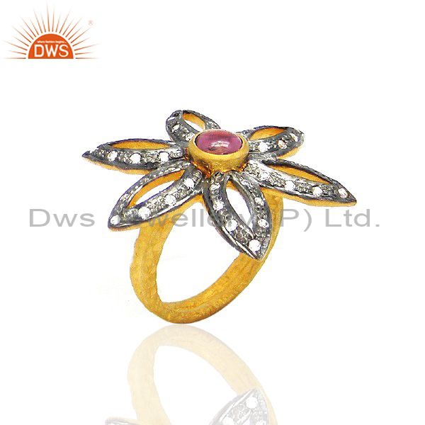 22K Yellow Gold Plated Brass Pink Tourmaline And Cz Flower Cocktail Ring