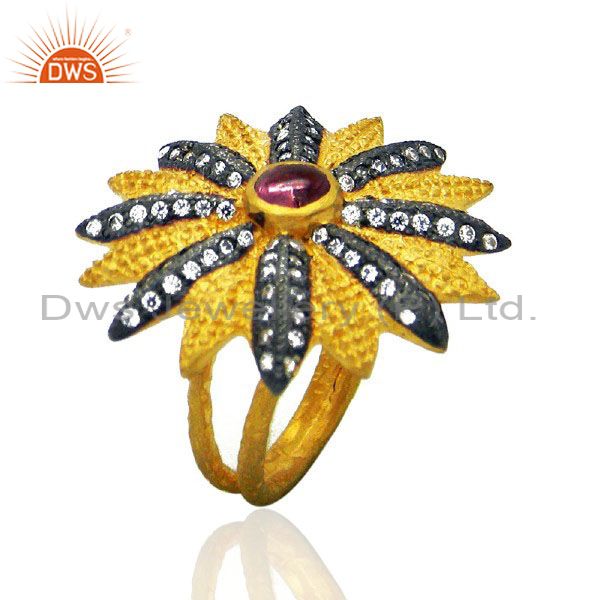 22K Yellow Gold Plated Pink Tourmaline And Cz Flower Design Cocktail Ring
